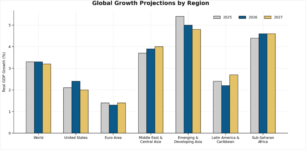 Global economic growth remains positive overall, but it is increasingly uneven across regions. The world economy is still expanding at a moderate pace, supported by technology investment, services demand, and fiscal support, particularly in the United States and parts of Asia.