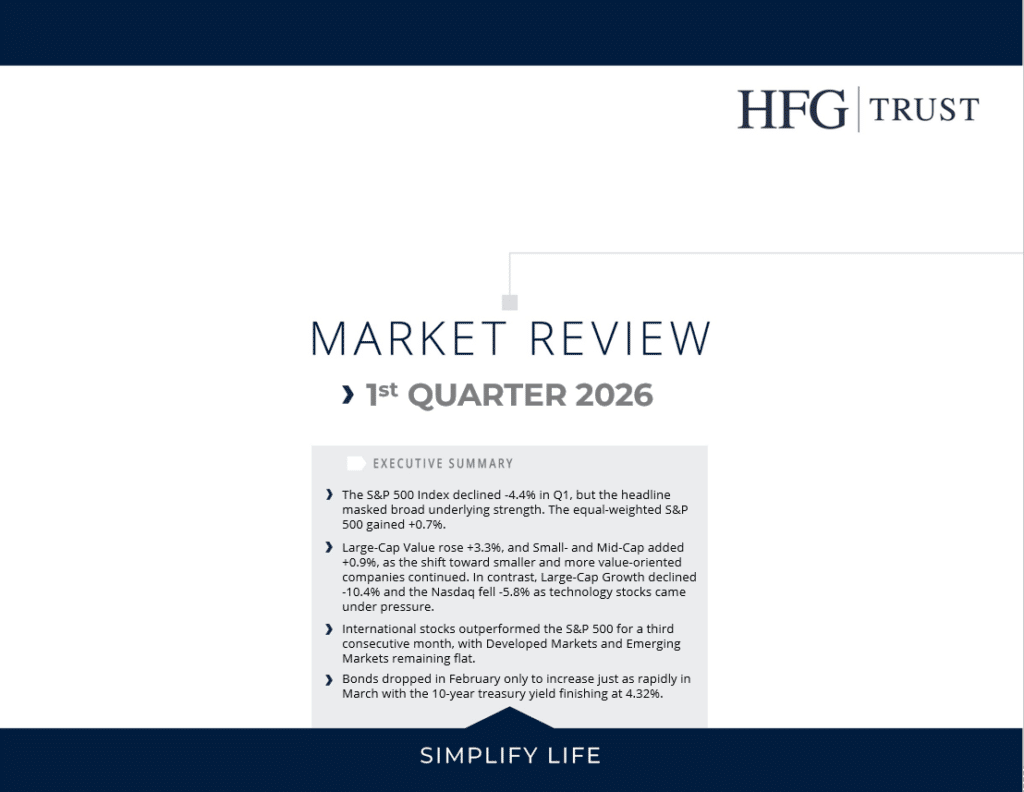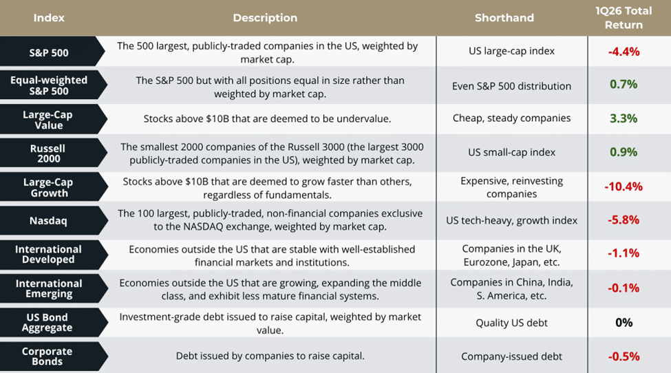 Heading into 2026, market sentiment resembled a delicate balancing act, with optimism about growth tempered by concern over inflation and rates potentially disrupting the balance. As the quarter unfolded, markets were reminded that economic transitions arerarely smooth. The quarter felt worse than it actually was, underscoring the importance of discipline, diversification, and long-term perspective during periods of uncertainty.
