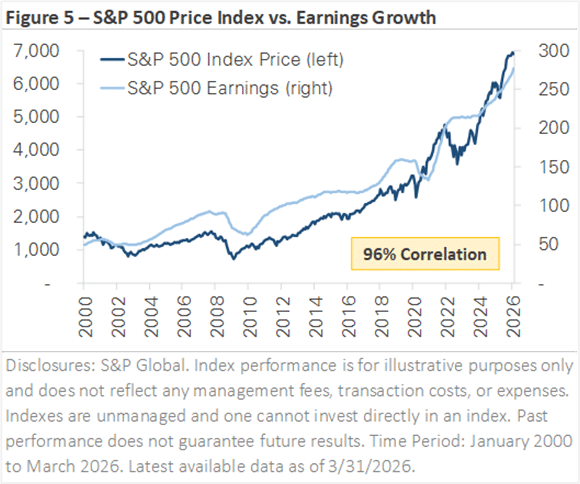 While the market’s decline in Q1 drew attention, it’s worth stepping back to look at the bigger picture. Figure 2 shows the relationship between the S&P 500’s price and its earnings over the past 26 years. The two have moved together with a 96% correlation. When earnings rise, stock prices generally follow. When earnings decline, as they did during the 2001 recession, the 2008 financial crisis, and the 2020 pandemic, stock prices tend to fall.