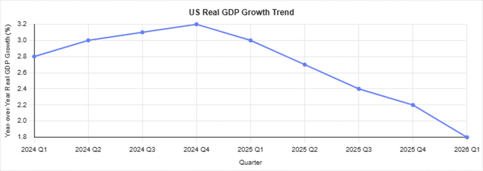 First quarter data for 2026 suggests the economy is slowing gradually, akin to a late-cycle slowdown rather than a sharp downturn. US growth is slowing from above-trend levels, the labor market is softer but still functional, and consumer spending remains supported, though uneven.