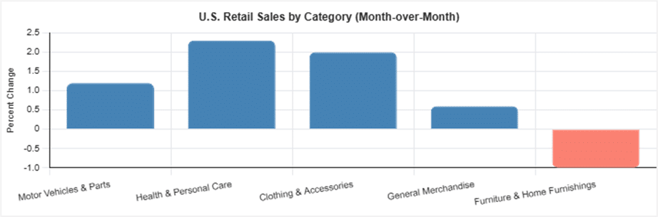 Retail sales rebounded late in the quarter, driven by motor vehicles, health‑related spending, and discretionary categories, as higher‑ticket items like furniture lagged. This pattern suggests elevated prices and borrowing costs are influencing where households are willing to spend.